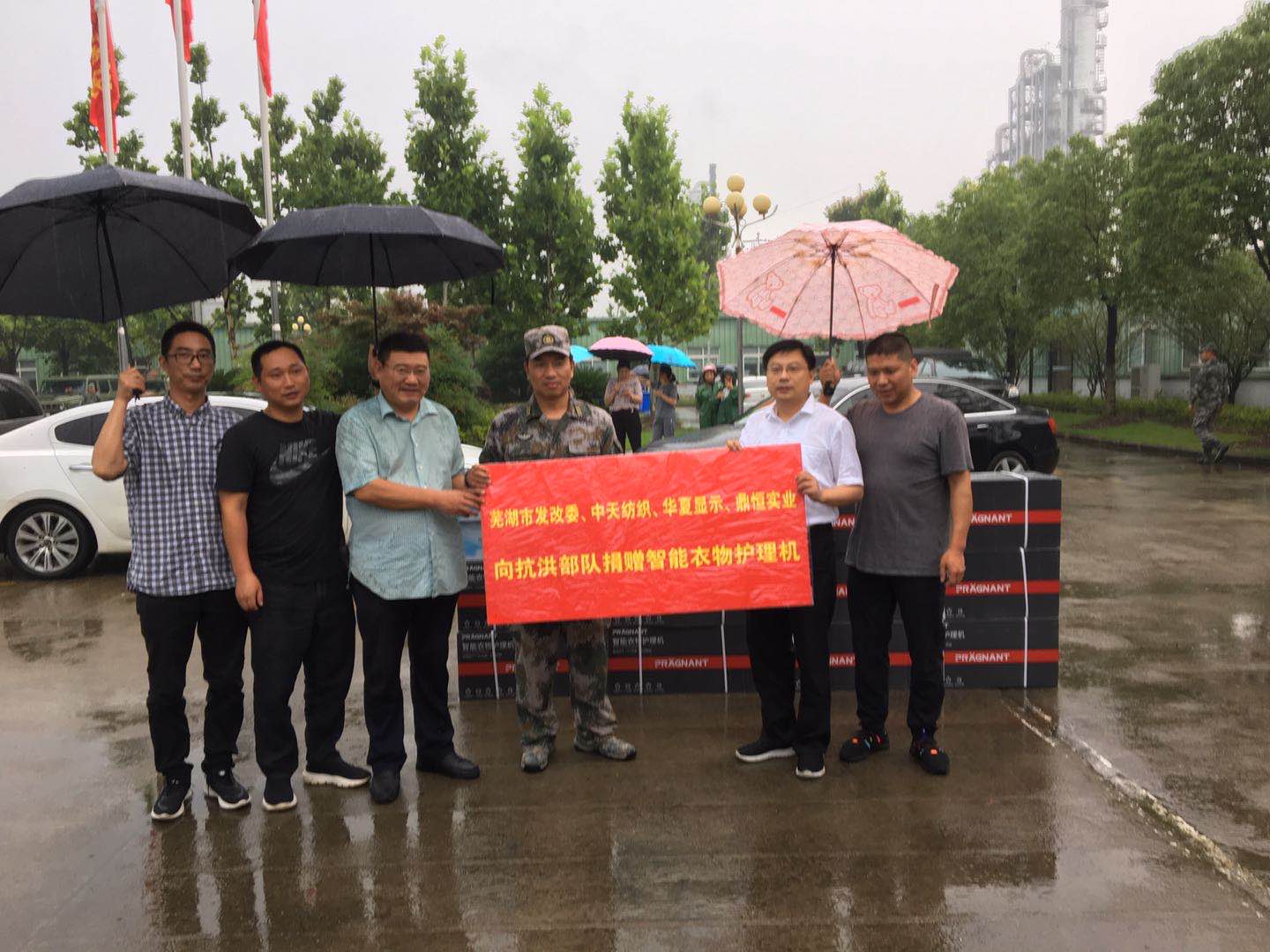 了解到蕪湖市的汛情后,7月18日上午,安徽中天紡織科技股份有限公司等企業(yè)同蕪湖市發(fā)改委共同向抗洪部隊(duì)捐贈(zèng)了智能衣物護(hù)理機(jī)用于支援蕪湖市汛情。