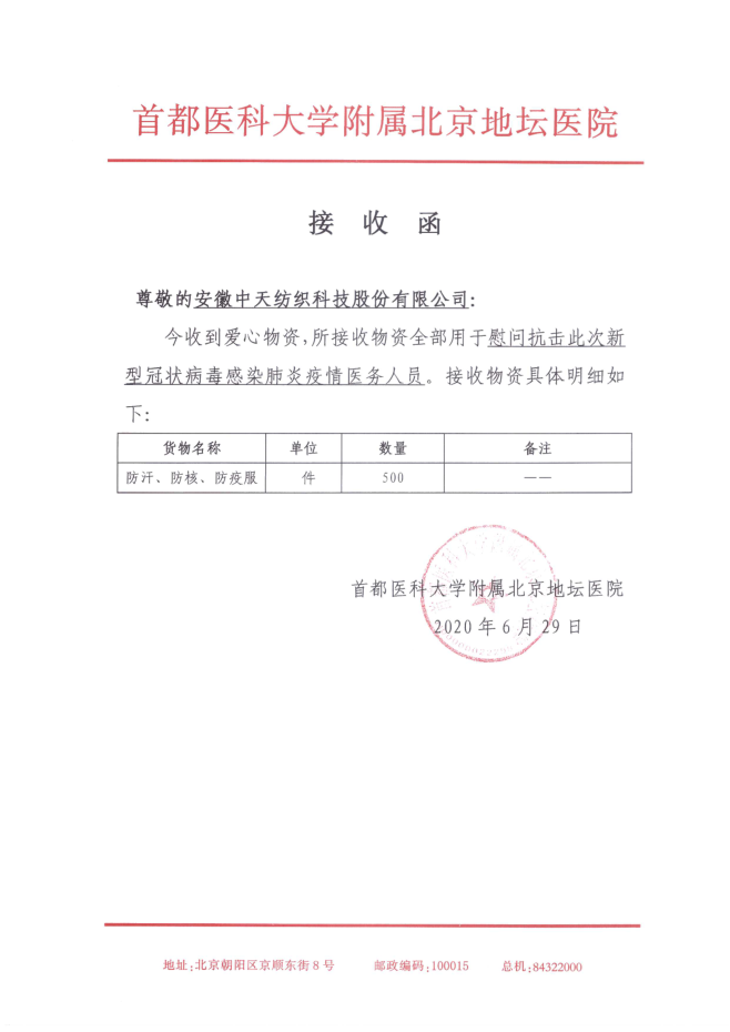 自6月11日,北京突發(fā)疫情反彈進(jìn)入防疫戰(zhàn)時(shí)狀態(tài)后,安徽中天紡織科技股份有限公司向首都醫(yī)科大學(xué)附屬北京地壇醫(yī)院捐贈(zèng)了500件防汗、防核、防疫服,用于慰問(wèn)抗擊此次新型冠狀病毒肺炎疫情的醫(yī)務(wù)人員。首都醫(yī)科大學(xué)附屬北京地壇醫(yī)院作為北京目前獨(dú)家承擔(dān)收治任務(wù)的醫(yī)院,各部門(mén)有序應(yīng)對(duì),再一次體現(xiàn)了地壇速度。